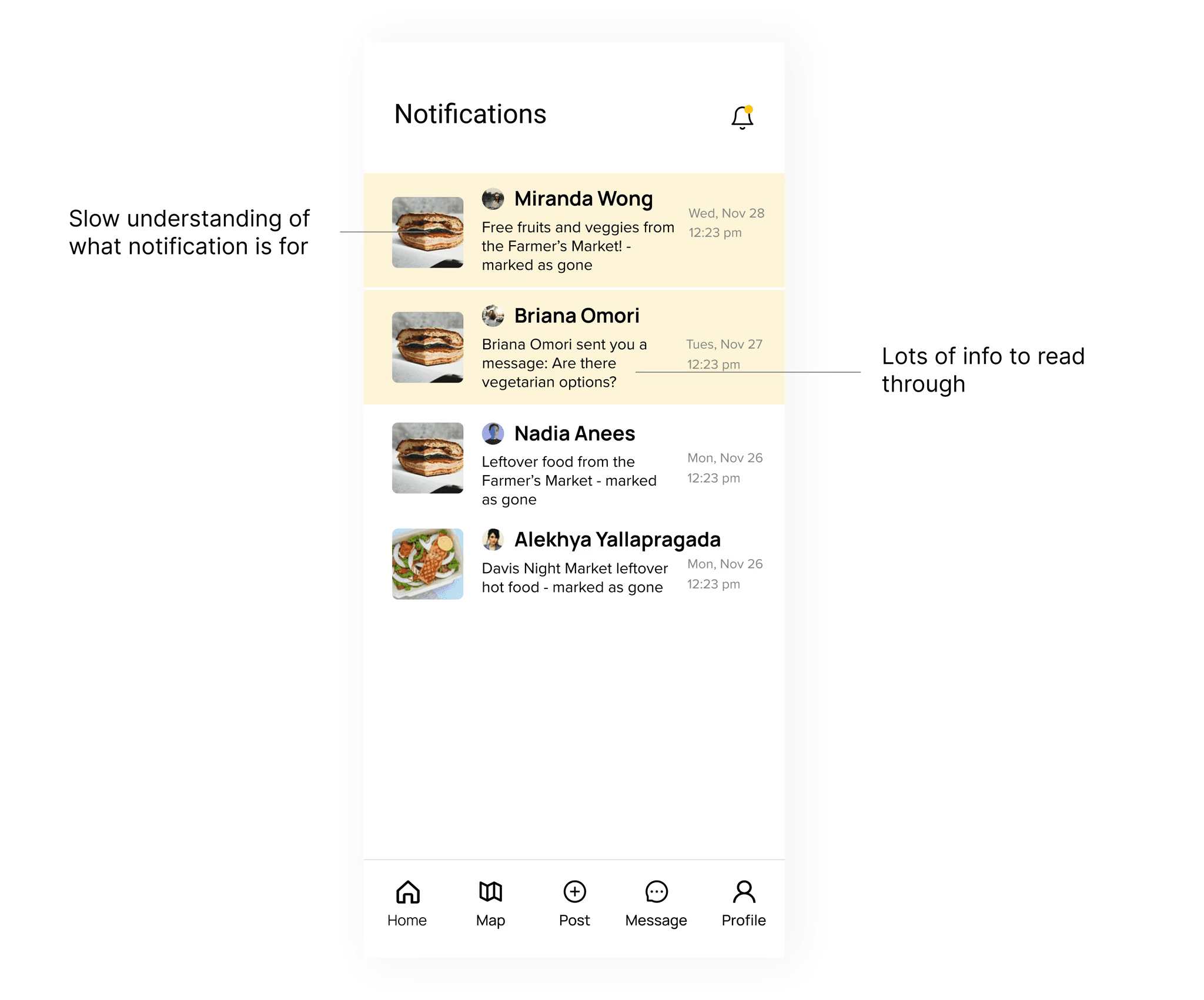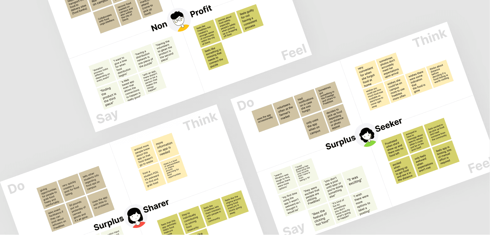 Our main research goals were to understand the food sharing process and identify the different types of users that might use the app and their pain points, goals, and needs.